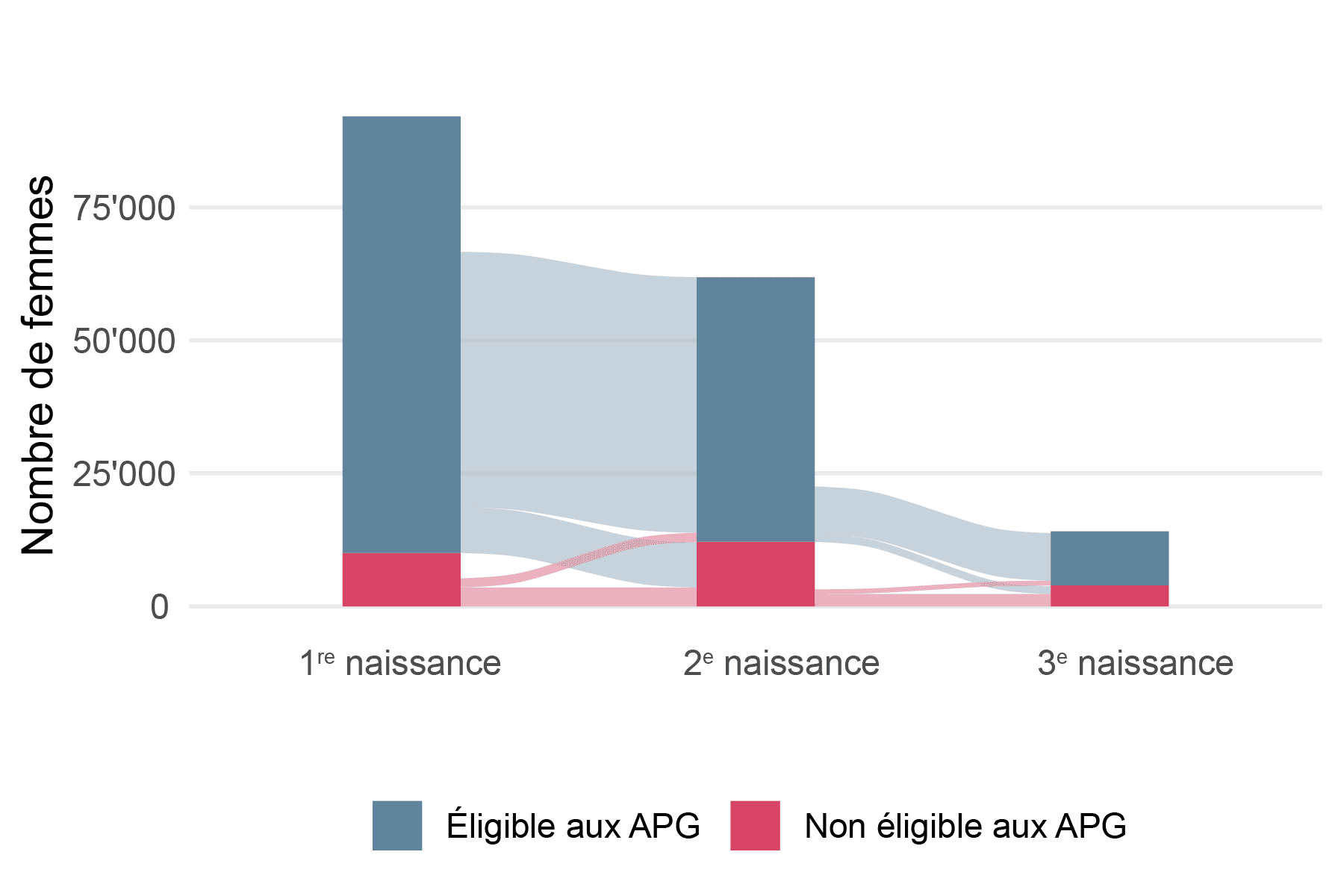 En examinant les transitions entre les naissances, on constate que la plupart des mères de plusieurs enfants conservent leur statut d’éligibilité et donc leur statut sur le marché du travail. La majorité des mères ayant droit à un congé de maternité lors de la naissance de leur deuxième ou troisième enfant étaient également éligibles lors des naissances précédentes. Les mères qui n’étaient pas éligibles lors de la naissance de leur premier enfant ne le sont souvent pas non plus lors des naissances suivantes. Il existe aussi un petit nombre de mères qui obtiennent pour la première fois ou qui retrouvent leur droit à l’allocation lors des naissances suivantes (3 % lors de la deuxième, 6 % lors de la troisième). Il y a lieu de supposer que la grande majorité des femmes prennent leur congé de maternité lorsqu’elles y ont droit (voir également Roth et Unterhofer 2025).